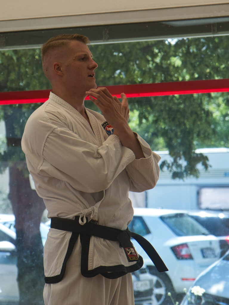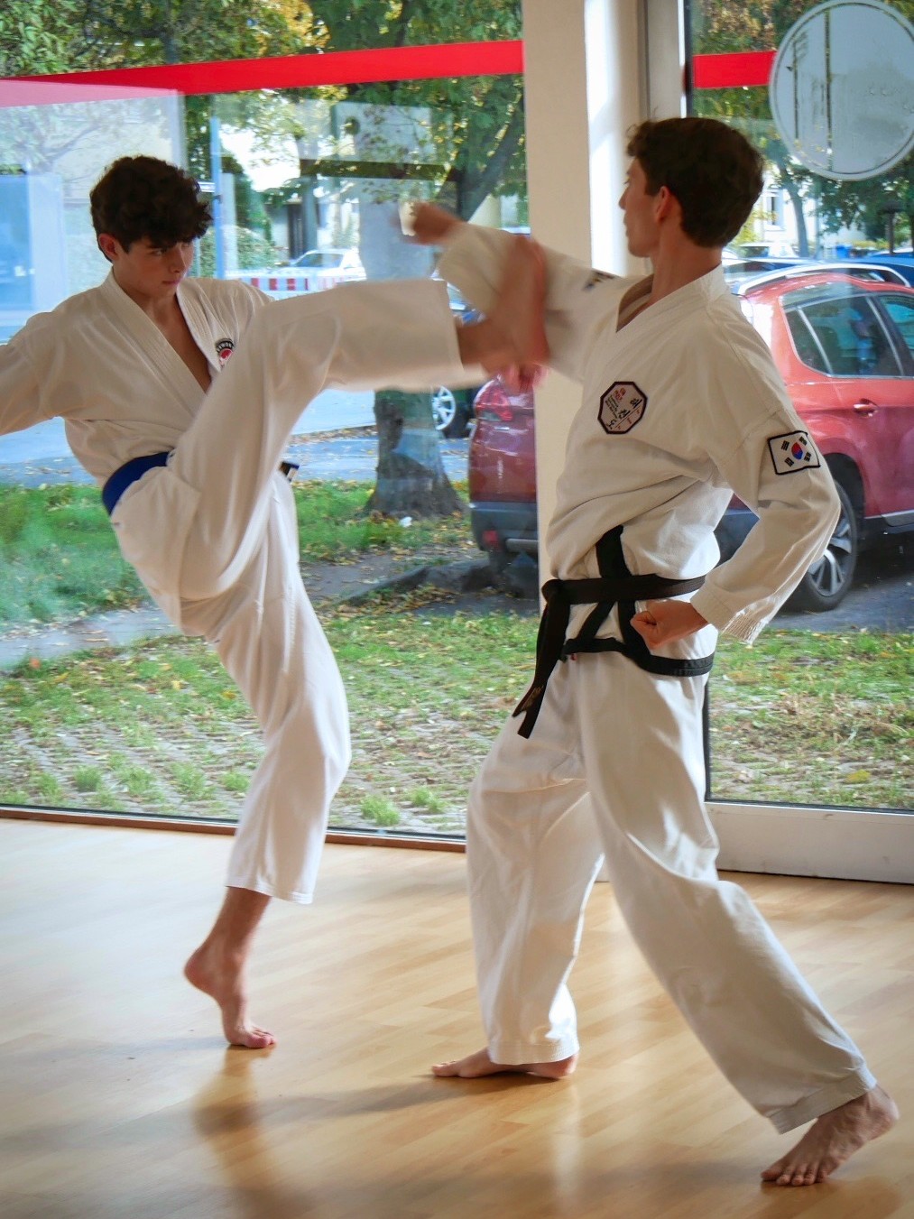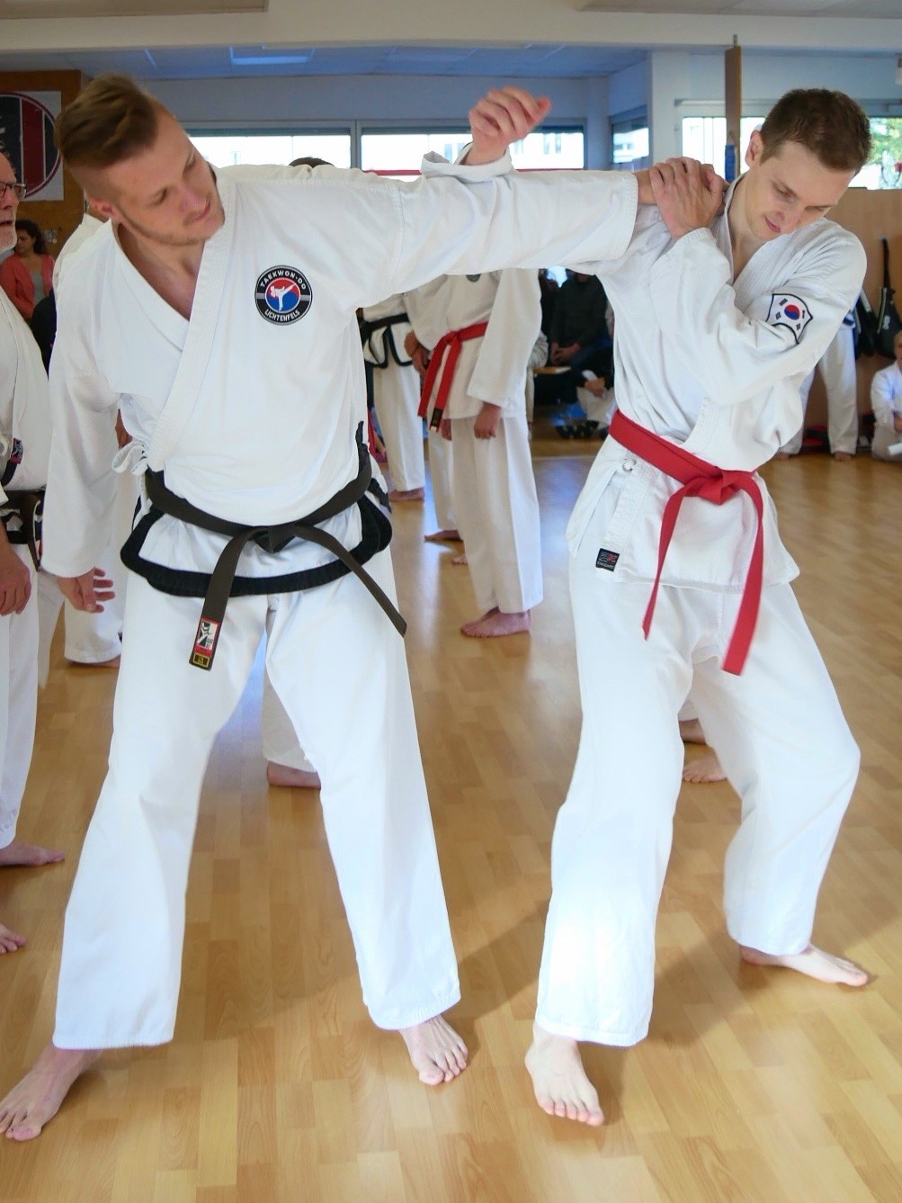 Bei der Selbstverteidigung (hosinsul) werden Sparring-Techniken genutzt, um sich in einer plötzlichen Gefahrensituation gegen einen bewaffneten oder unbewaffneten Angreifer zu schützen. Die Schüler:innen verstehen und lernen dabei, wie die Kraft des Angreifers mit der eigenen Bewegung kombiniert wird. Dadurch wird gelernt, schnell die gegnerischen Schwachstellen zu erkennen und einen Gegenangriff auszuführen, der den Angreifer handlungsunfähig macht.